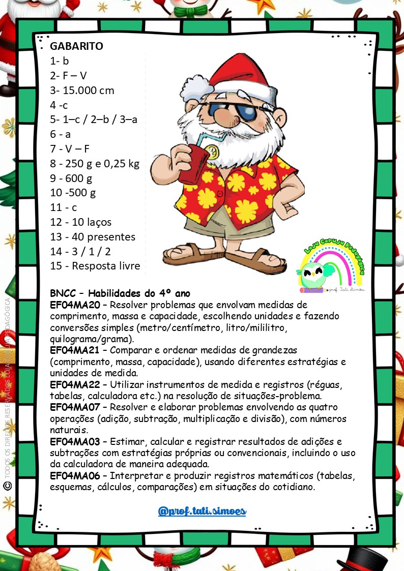 Seus alunos vão se conectar imediatamente com as situações-problema do Papai Noel, enquanto você avalia medidas, operações e unidades de medida com segurança pedagógica. Tudo pronto para imprimir e aplicar! 🎅📏