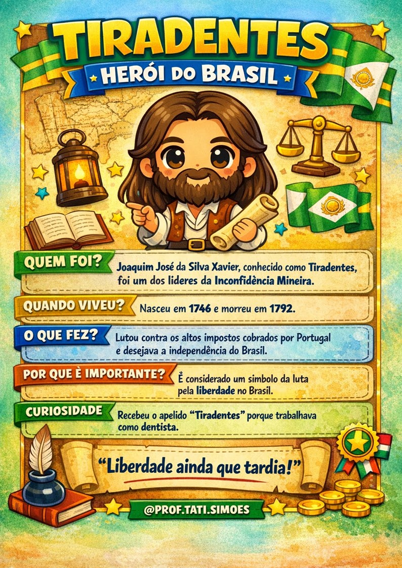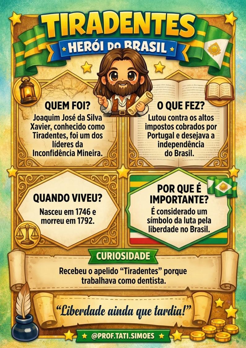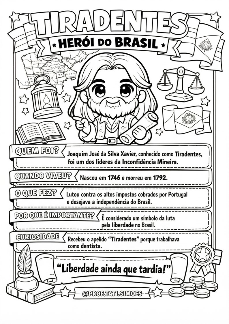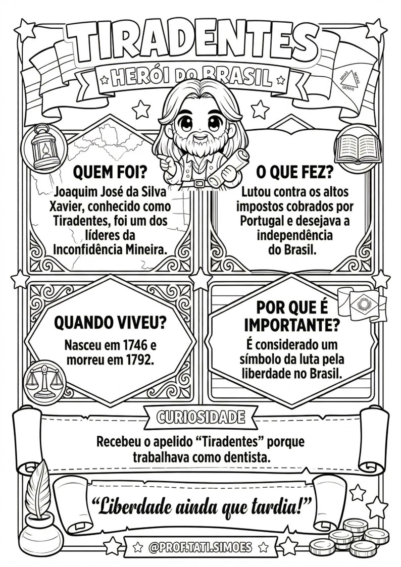 Conteúdo Histórico Detalhado: Mini biografia de Tiradentes, explicação sobre a Inconfidência Mineira, o contexto dos altos impostos cobrados por Portugal e o significado do lema “Libertas Quae Sera Tamen”.