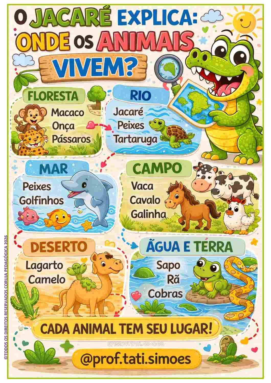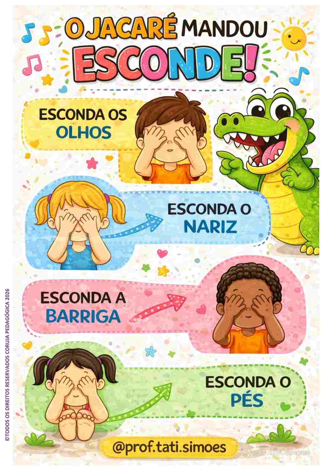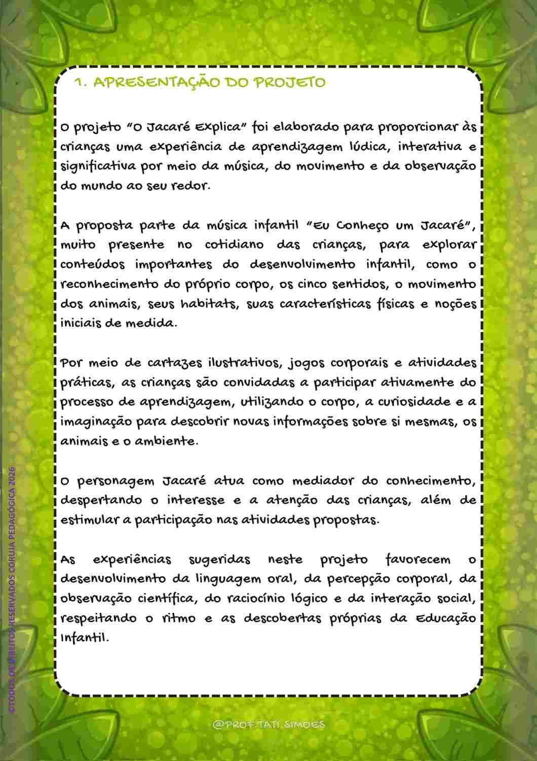 Inspirado na popular música infantil “Eu Conheço um Jacaré”, este recurso pedagógico foi desenvolvido pela Prof. Tati Simões para oferecer uma experiência de aprendizagem lúdica, interativa e profundamente significativa para crianças da Educação Infantil.
