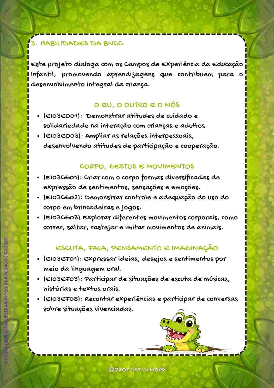 Este é um material completo que organiza o conhecimento de forma progressiva ao longo de uma semana. O projeto utiliza o personagem do Jacaré como mediador para explorar temas essenciais do desenvolvimento infantil:
